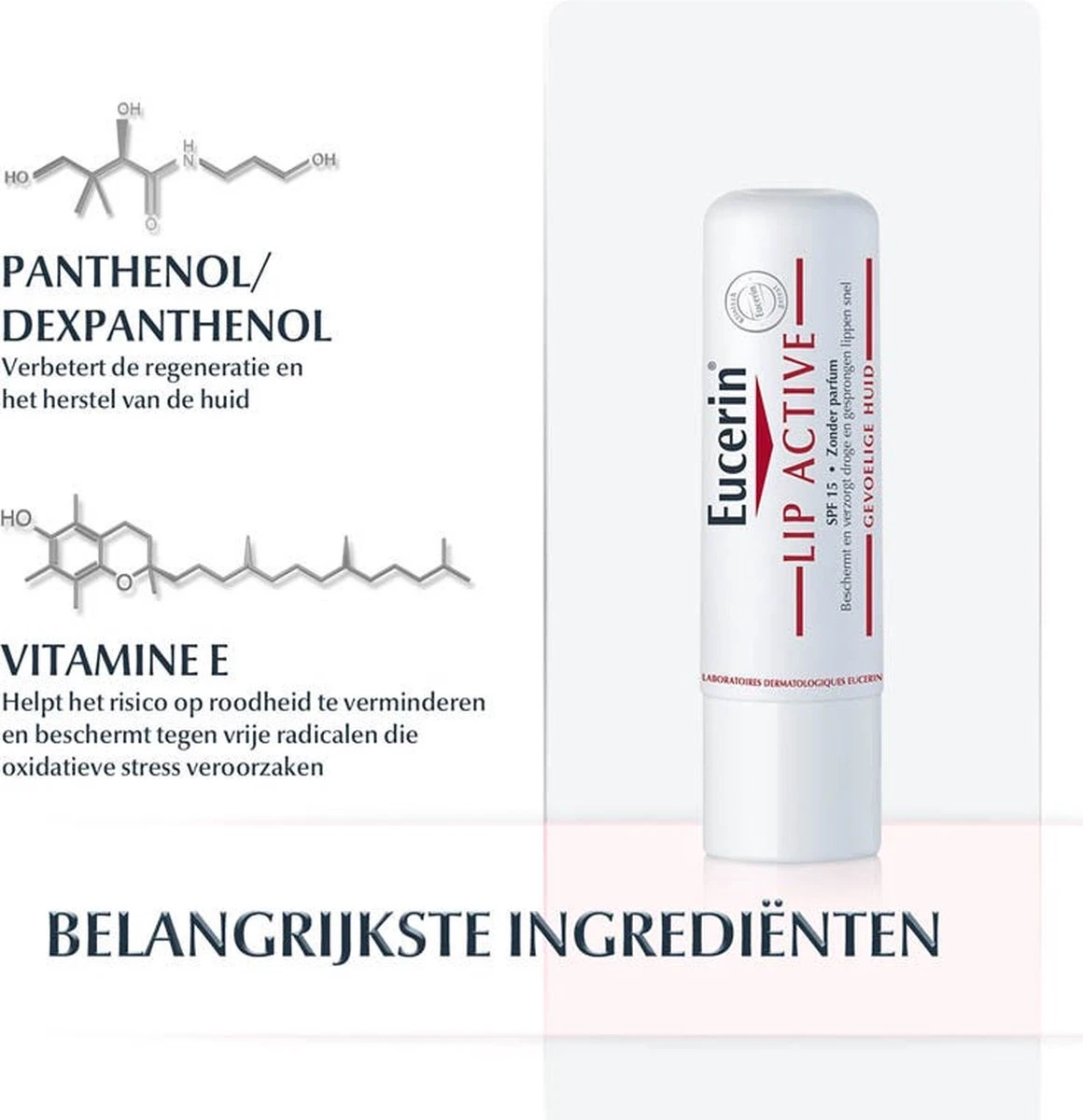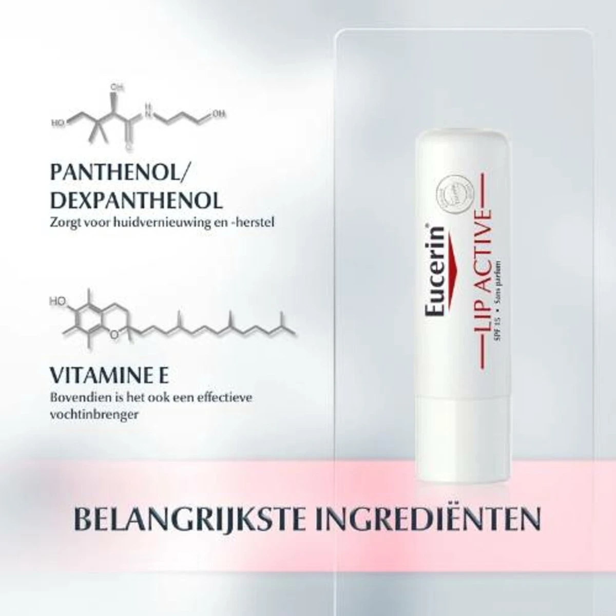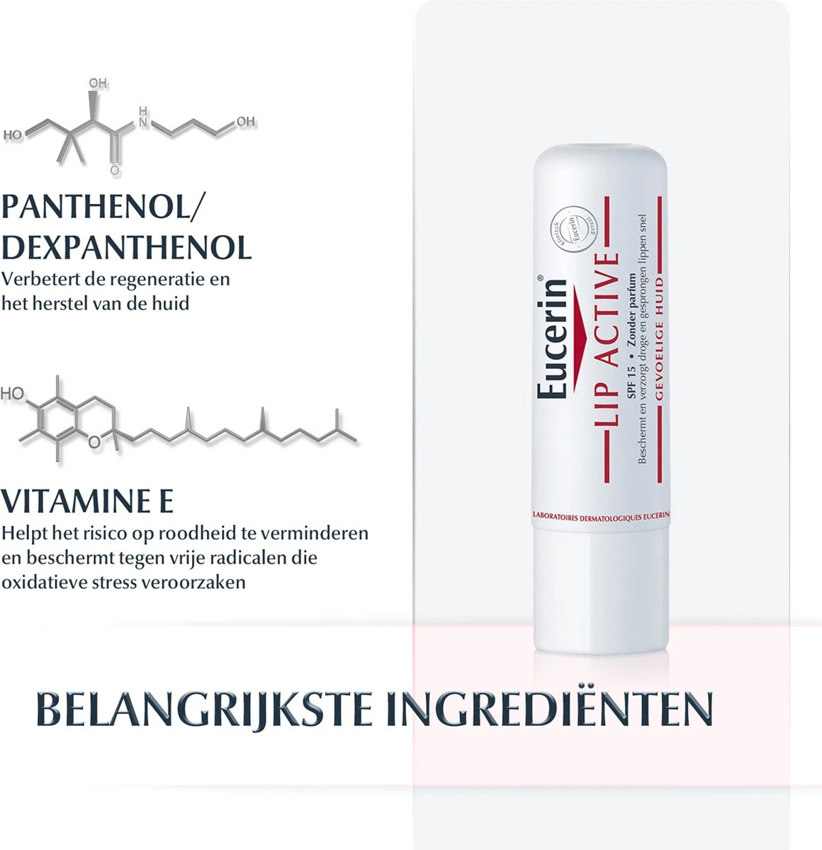 Dexpanthenol en vitamine E verzachten, hydrateren en beschermen tegen dagelijkse externe invloeden zoals blootstelling aan UV-straling en lage hydratatie. Regelmatig aanbrengen voor snelle verlichting en doorlopende bescherming van de dunne buitenste laag van de droge lippen. Met SPF 15.